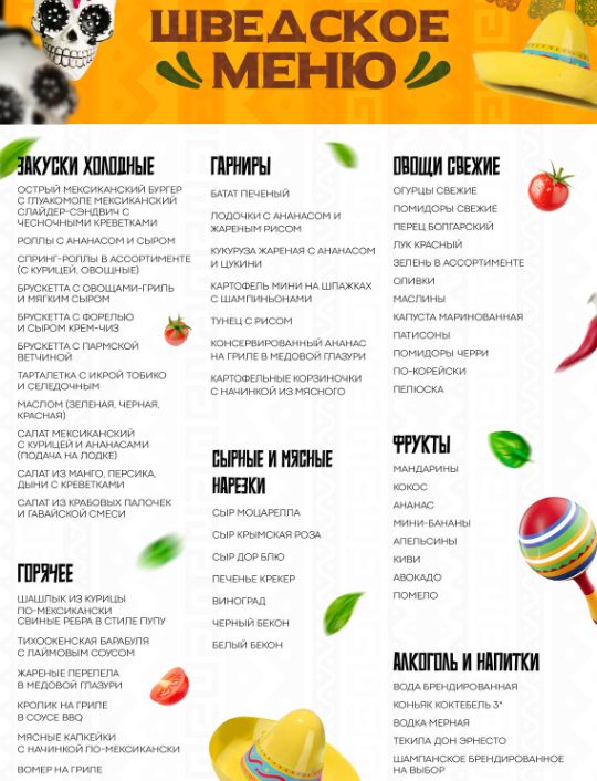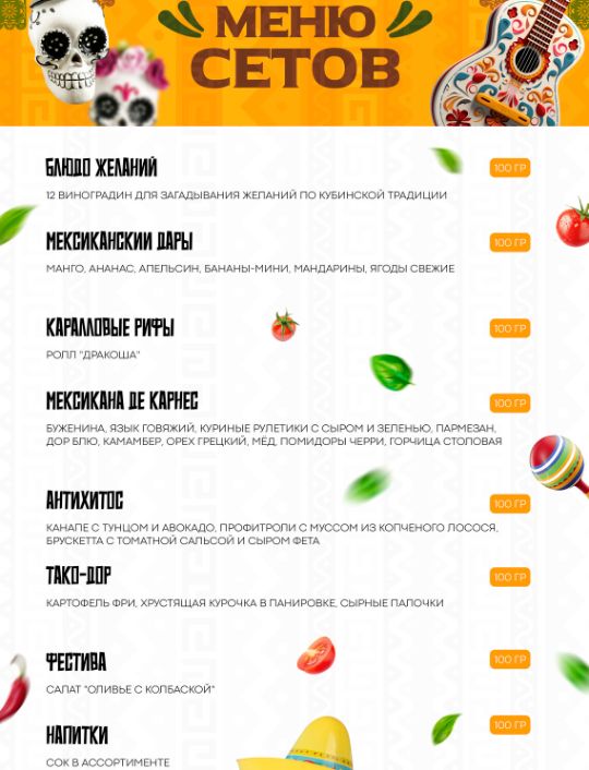Меню разрабатывалось русско-латинской командой специально для Вас и доступно только в новогоднюю ночь! Кстати, отмечать будем сразу в двух локациях: