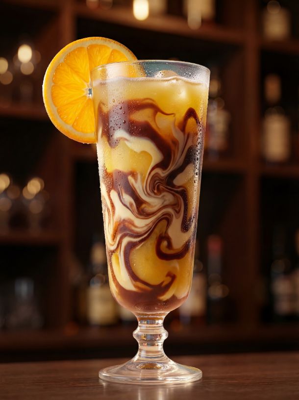 Тропический ананас встречается с нежным шоколадом и ванилью, создавая вкус десерта в бокале. Апельсиновая долька добавляет свежий цитрусовый штрих
